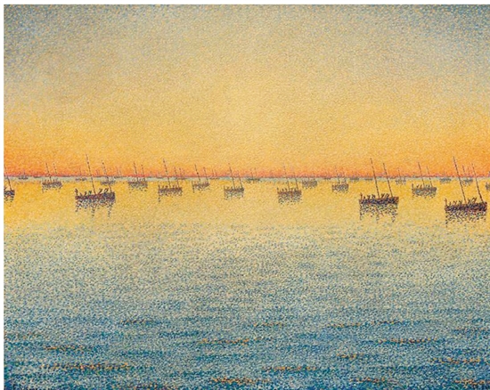 色彩是光影作用的结果,这一点无论是古典绘画,还是印象主义都是认同的。西涅克对色彩的运用同样包含对光影的研究,从他的作品中可以看出,他学习过浪漫主义大师德拉克洛瓦对光影色彩的运用。德拉克洛瓦曾在日记中记载了他对海面景色的研究。他发现《因为太阳在我后面,所以向我漾来的水波呈黄色,而面向地平面的那一面水波则反射着天空的色彩》。这一点与西涅克的作品《Setting-Sun》(1891)略有相近。尽管西涅克这幅作品所描绘的是略微正对夕阳的海面,但也体现了与德拉克洛瓦相似的观察。更进一步的是,西涅克增加了阳光透射水波所产生的高纯度橙黄色,显示了对色彩规律更深的理解。