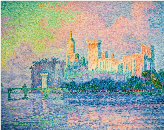 西涅克在遵循点彩派的色彩混合原理的基础上,根据不同的效果呈现的需要,灵活地采用了不同的色彩并置方法。在表现明亮的、高纯度的色光效果时,多使用同类色与邻近色的并置,而在表现中间色的混合时,则使用互补色与对比色的并置。他对同类色的并置运用完美地体现在《Paul_Signac_Palais_des_Papes_Avignon》中。在这幅画中,醒目且叛逆的颜色充斥着整幅画面,鲜亮的黄绿色、梦幻般的紫红色、火热的橙红色通过细小纯色点的加法融合,产生了荧光屏的效果,极具冲击力。