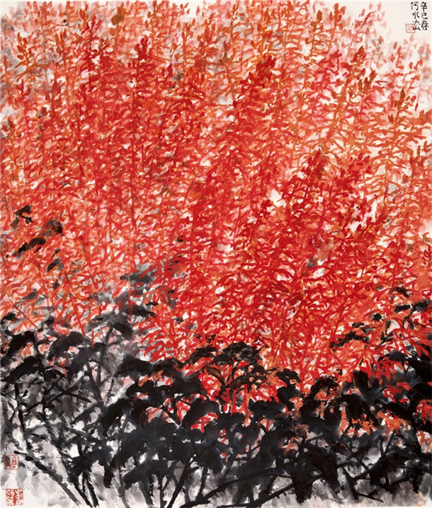 其二,何水法十分注重传统笔墨的现代形态转向,且在笔法中聚合了墨法和色彩的综合呈现。例如,他往往会放大笔墨在宣纸上逐渐洇渍和渗化的视觉感受,使得观者的注意力更多地投放到笔性的质感形态之中。更为重要的是,何水法试图淋漓尽致地表现出自然花卉通透亮艳的属性特征,即花卉物象在自然光线下的明豁感,其中既追求传统笔墨的蕴藉、含蓄和文雅,又凸显自然色彩的响亮、明快和真实,甚至主动融入西方现代派和印象派绘画中之光影感和即兴感的表现方式。实际上,明豁感是一种非常不易表现的语言风格,它与传统绘画中提到的“雅俗”观念以及对笔法、笔性、笔质的具体评判等问题息息相关。因此,何水法通过笔法转化、浓淡互破、色墨互融等一系列方法所解决的问题,即是如何在生与熟、雅与艳之间找到一种恰切的平衡感和结合点,以强化画面的节奏感和通透感。